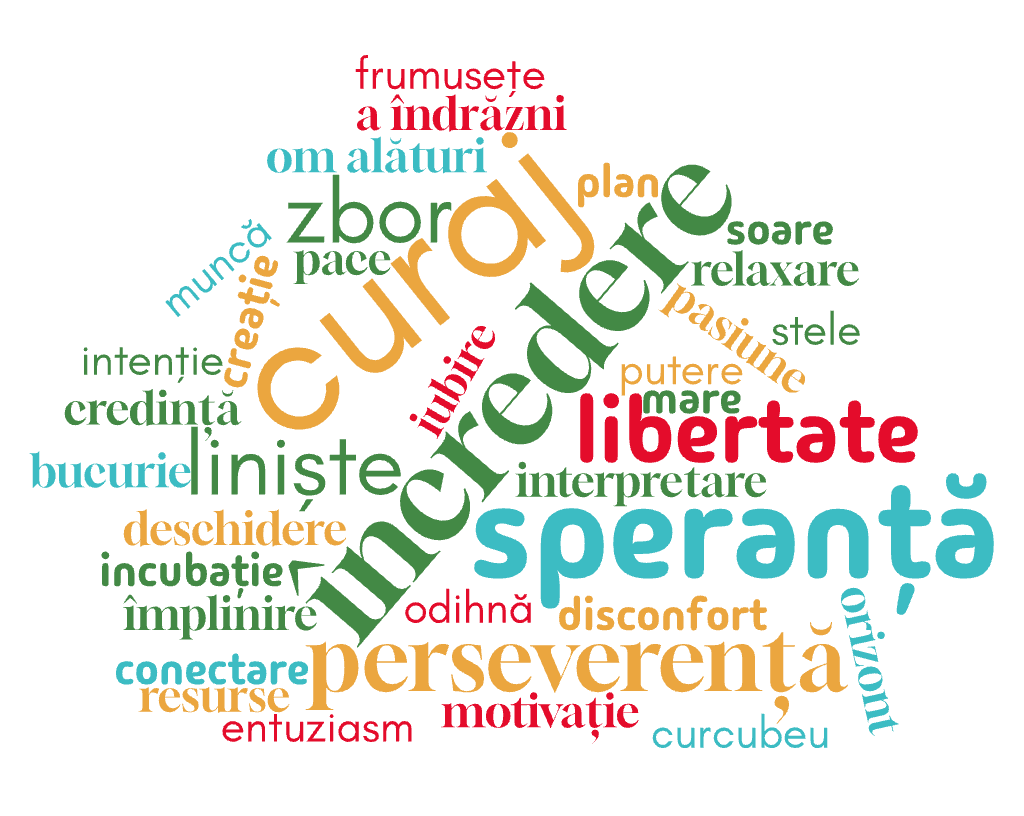 Mă simt recunoscătoare pentru fiecare contribuție și vis pus laolaltă care astfel dă naștere acestui text. Am putut observa cum foarte des în asocierea cu ceea ce vă doriți a împlini vine ideea de forță exprimată prin curaj, încredere, putere, perseverență, credință, a îndrăzni, împletită cu sfera vastă a orizontului prin libertate, stele, zbor, creație, frumusețe, soare, entuziasm, deschidere, speranță, mare.